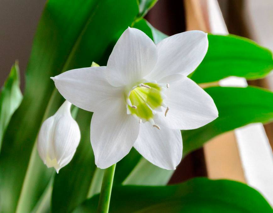 An excellent choice is eucharis. Its exquisite flowers are outwardly similar to daffodils. Flowering begins in autumn, and when it ends, eucharis pleases the eye with decorative foliage.