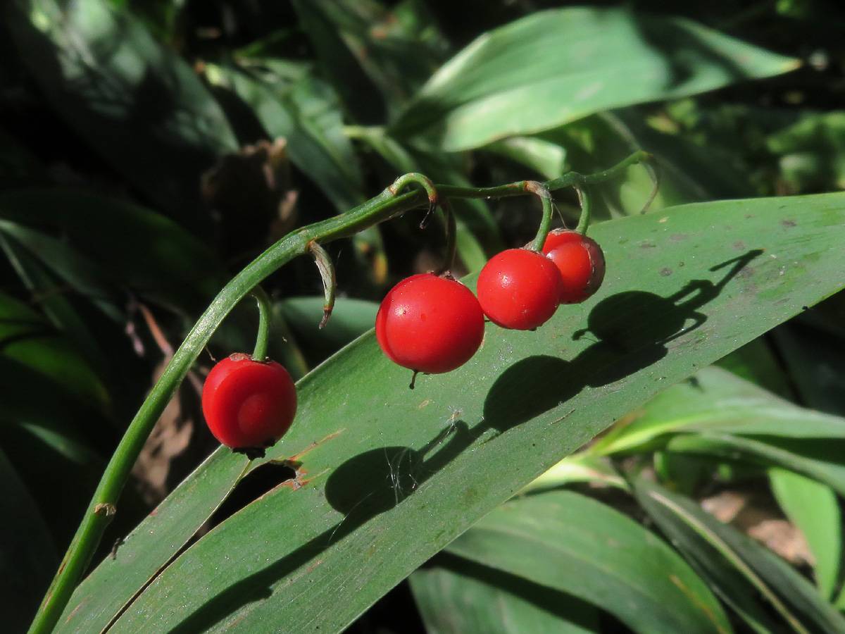 Mountain lily of the valley is more common in North America. Prefers mountainous terrain, so the root system is well developed. The bushes are tall - a little less than half a meter in height. In this case, the peduncle almost does not protrude above the leaves. The number of buds on it can be from 5 to 16 pcs. The bud itself reaches 9 mm from the stem to the denticles. The berries are red, about 0.8-0.9 mm in diameter.