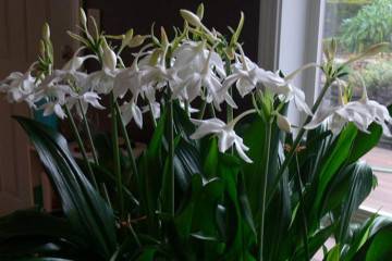 The green stem comes from the bulbs and points straight up. It usually has a varied number of leaves. Platinum plates are arranged in a spiral manner. In the corner of the last leaf from below, a bud is formed, which grows, turning into a new bulb that can bloom in a year. Thus, natural reproduction occurs.