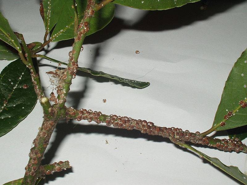 One of the most dangerous pests in the garden, belongs to the family of worms. The insect is small, it is difficult to spot single specimens. Scabbards cover the leaves with a sticky bloom. In fact, it is not they themselves that are dangerous, but this raid. Deprived of oxygen, green leaves of plants become vulnerable to viruses and bacteria.