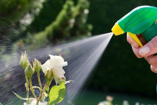 Rose bushes and surrounding plants are treated with one of the chemicals described below.