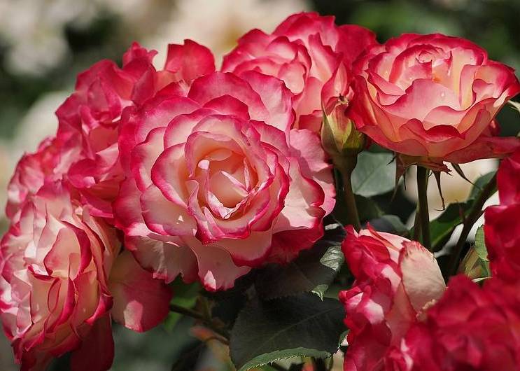 Jubile du Prince de Monaco is called one of the most spectacular roses in this category. The blossoming creamy white petals are edged with a bright crimson border, which expands as the flower unfolds, changing the tone to cherry. Terry flowers are large, the diameter of one reaches 10-11 cm.The height of an adult plant is 70-80 cm.