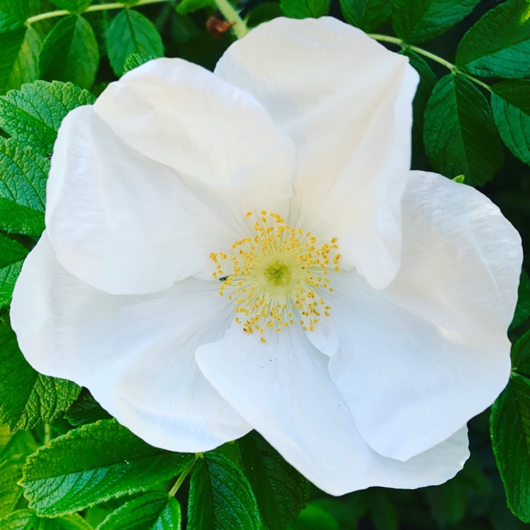 The re-flowering roses of this group include the Rugosa Alba variety, which is distinguished by large single snow-white flowers. The buds have a pleasant sweetish aroma. After the shrub has faded, red-orange fruits appear on the shoots.