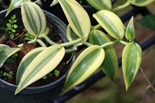 Florists love this variety for its elegant greenery. The leaves of this vanilla have light stripes. The heterogeneous color (variegation) gives the plant an interesting elegant look.
