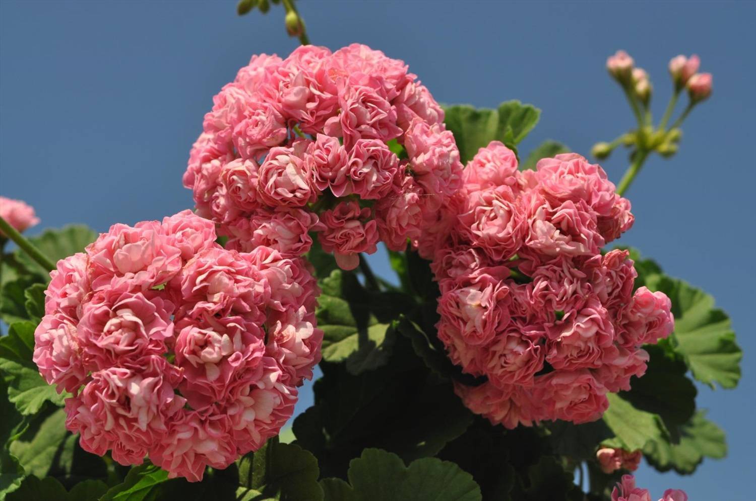 The flowers of the Pelargonium Australien pink rosebud consist of many pink petals. The buds are collected in inflorescences of several pieces.