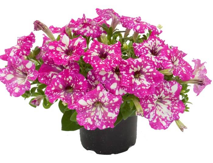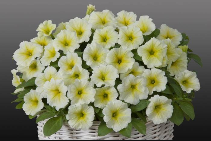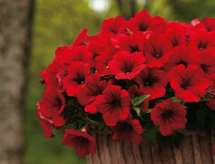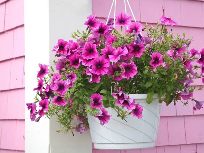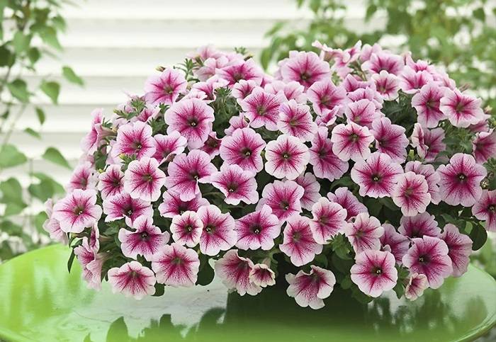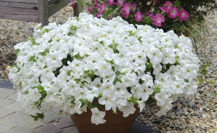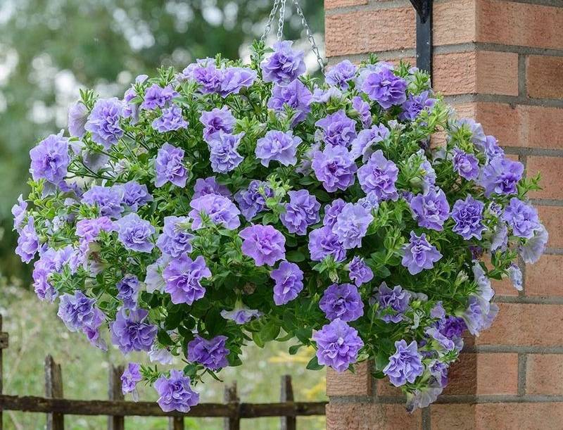 Ampel petunias, due to their flowing shoots, are best suited for hanging planters. The length of the stems varies from 30 to 120 cm. The bushes abundantly cover the funnel-shaped flowers. Most often grown as annuals.