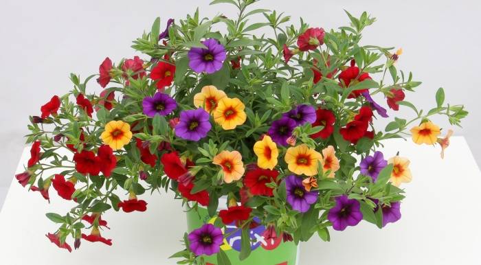 Calibrachoa are flowers that look like petunia, but are not. They also belong to the Solanaceae family. Shoots are long, up to 1.5 m, lignified at the base. The flowers are numerous, but small, up to 3 cm in diameter. The middle of the corolla is always colored in a darker color (in natural species, yellow or black).