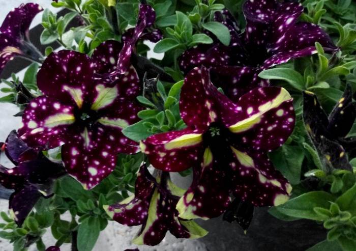 Petunia Stormy sky - a variety with an unusual color of petals. They are dark wine-red in color with white dots. In strong light, diamond-shaped strokes of a pale yellow color appear on the petals.