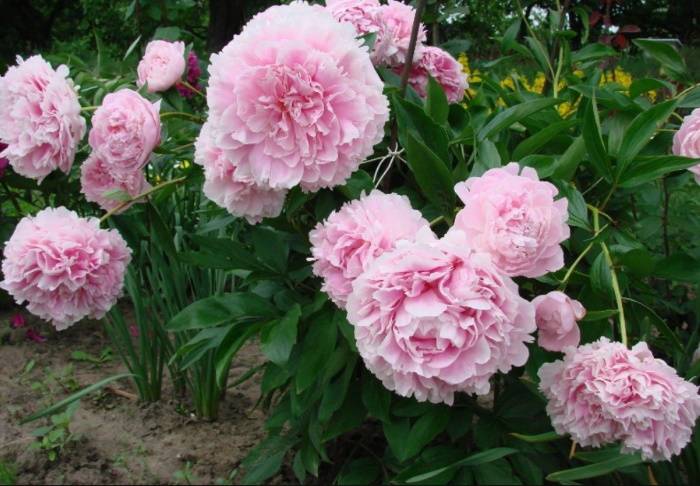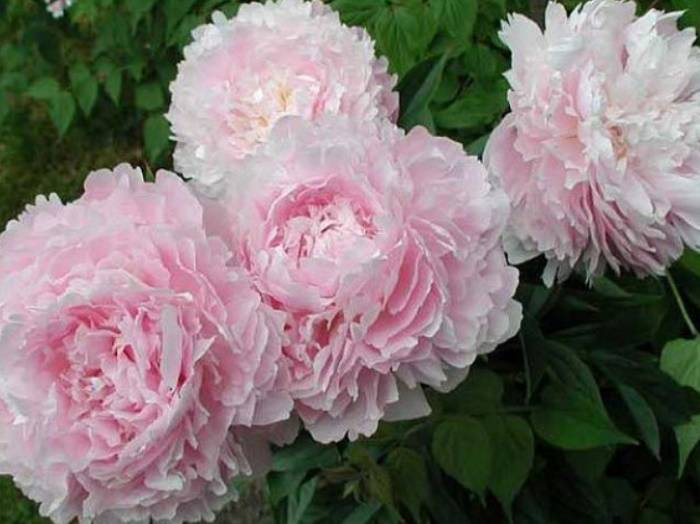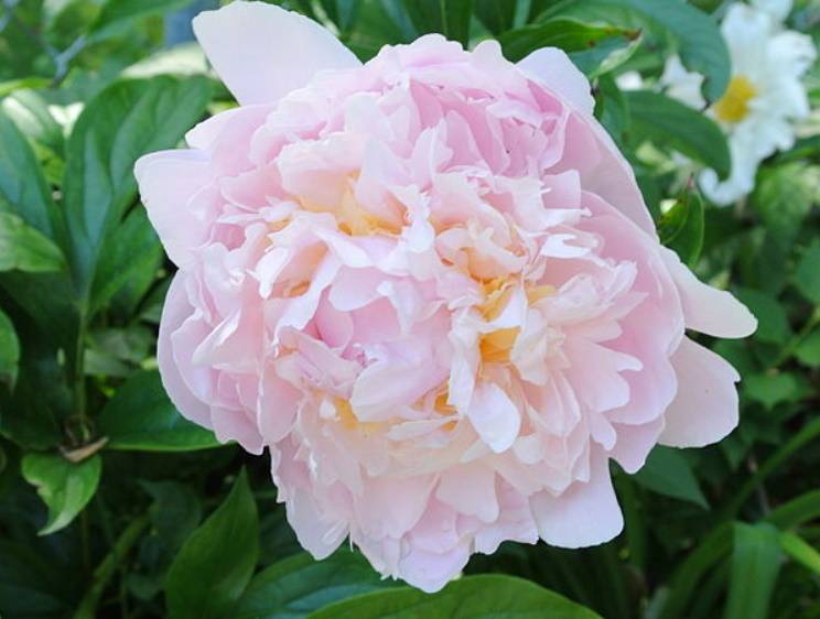 Growing in the bright sun, the Pillow peony, belonging to the group of lactic-flowered herbaceous Paeonia, forms very large pink-shaped inflorescences with a diameter of 17 to 25 cm. Flowering begins in May and lasts about 3 weeks. The outer petals on half-open buds are painted in a creamy pink shade, the crown is light pink, a high rosette is formed in the center.
