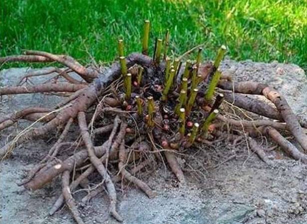 The best option would be to choose a well-drained piece of land with loamy fertilized soil. The planting hole should have a depth and width of about 50 cm. The root cutting is laid out in it at an angle and sprinkled with earth.