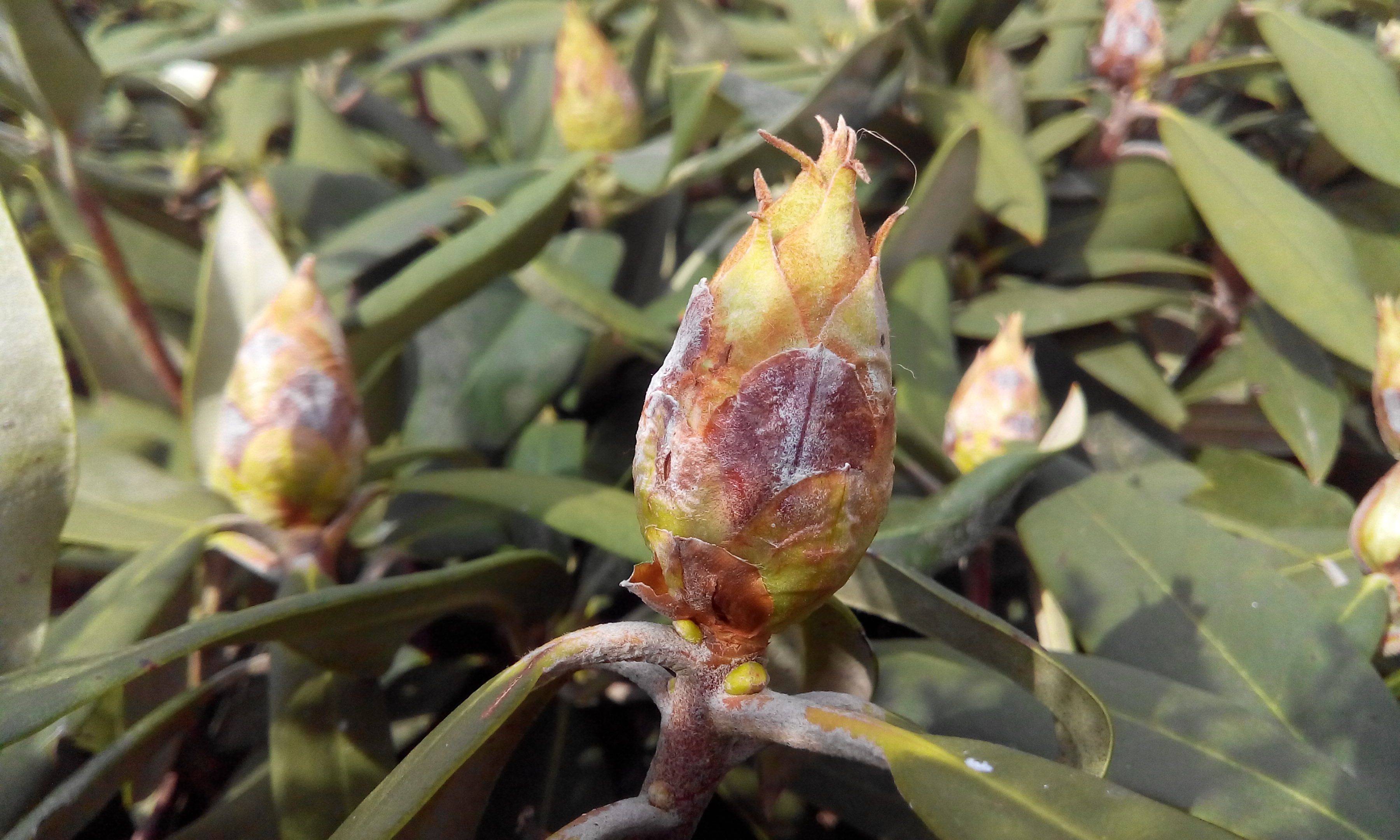The reason why rhododendron does not bloom can often be the presence of any diseases. If brown spots appear on the surface of the flower, which then dry out and leave a dusty coating, then the plant is affected by gray mold. The reasons for its appearance can be high humidity and ambient temperature above 15 ºС. To combat this infection, you need to plant the bushes not too tightly to each other and immediately remove them when affected shoots appear.