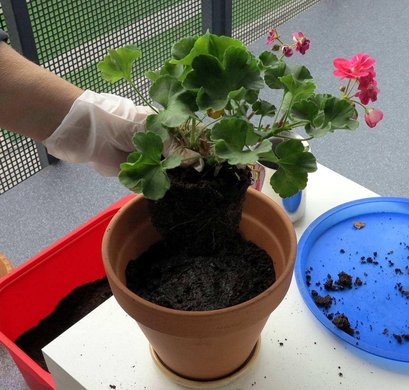 After transplanting, the flower pot is removed to a dark place for several days. Experienced growers recommend spraying geraniums with Zircon every two days after transplanting, this will reduce the stress of the plant. After a week, the flower can be placed on the east side window. After 2-4 weeks, top dressing with universal fertilizer.