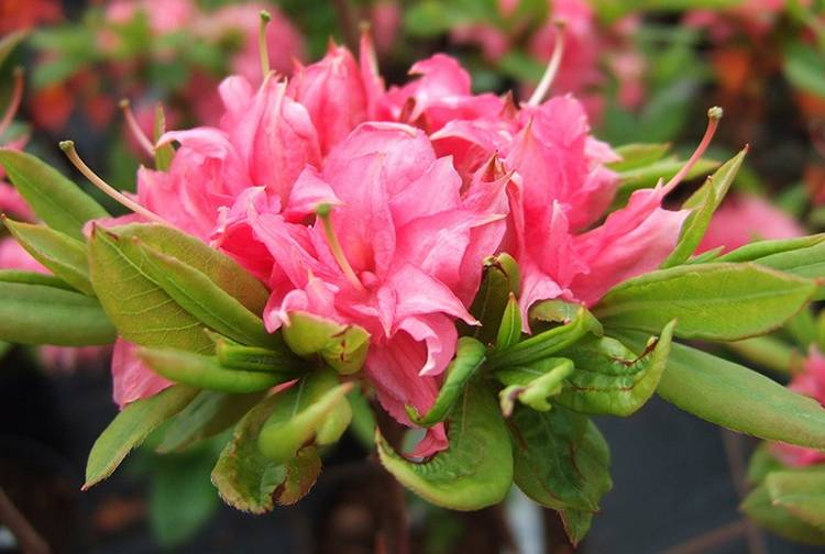 Some people think it is a Finnish hybrid, but it is not. Differs in incredibly abundant flowering and the ability to easily endure fairly severe frosts. With good care, it can reach a height of 1.5 m. The bush has a spreading branchy crown. Light green leaves are lanceolate, slightly concave inward. In the fall, they change color, becoming bright burgundy. Intense pink flowers with orange splashes of flowers are collected in inflorescences of 8 pcs. They appear from the end of May and bloom all summer. They have an incredible aroma.