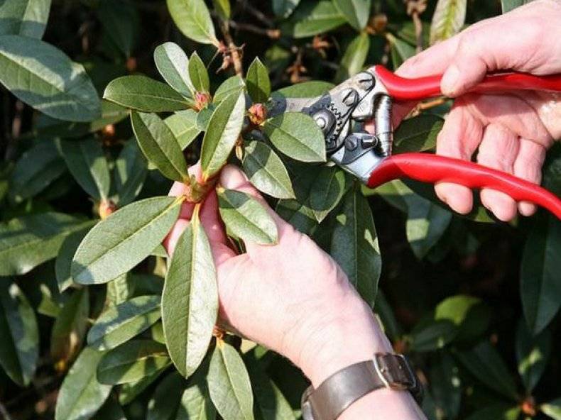 Caring for a rhododendron means pruning it on time and competently. You should break out the faded inflorescences immediately after the end of flowering. This procedure is safe for the plant and will encourage the formation of new lateral buds.