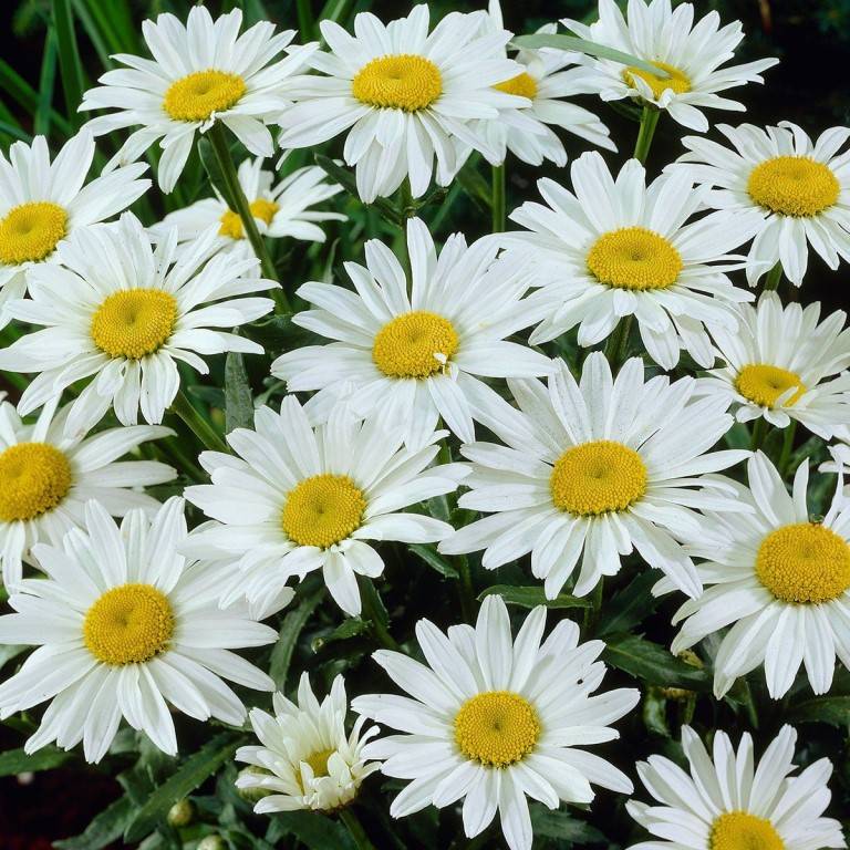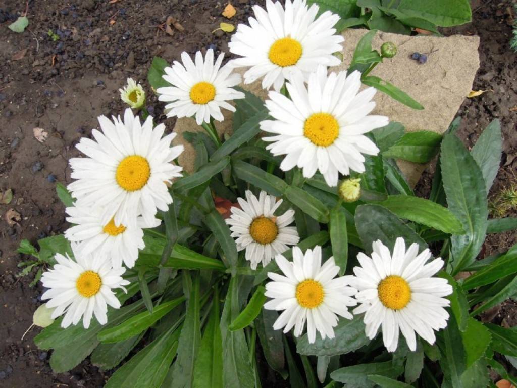 The most popular large chamomile variety. The plant forms a bush 80 cm high. Inflorescences up to 12 cm in diameter. The variety is unpretentious, drought-resistant. Seeds are planted in open ground in the fall so that the plant will please with flowering next year.
