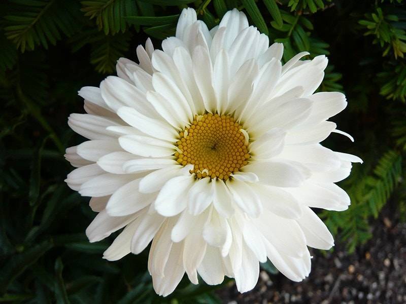 The variety is popular with Russian flower growers for its unpretentiousness and frost resistance. The compact bush reaches a height of up to half a meter. Against the background of dark olive glossy foliage, single snow-white inflorescences-baskets look attractive. It blooms for 2 years after planting the seeds, in order to see early flowering, the variety is grown in seedlings.