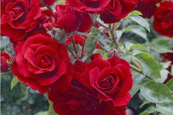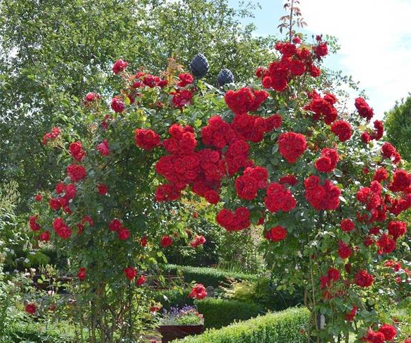 Amadeus roses are the smallest among climbing roses. They grow up to only 3 meters. The bush can reach 2 meters in diameter. The main advantage is resistance to the influence of scorching sun rays. The bright red flowers of the Amedeus rose look spectacular against the background of dark green foliage.