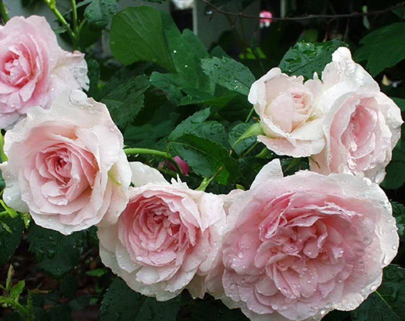 The Blush rose is a multi-flowering plant. Each bloom is lush, racemose inflorescences hide behind them almost the entire green mass of the plant. The surface of the petals is densely double, the color is pale pink.