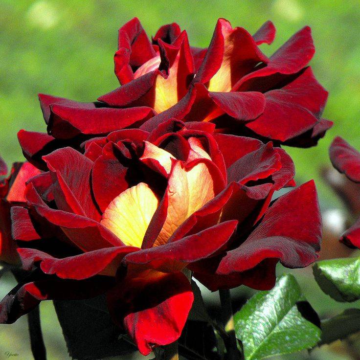 The flower petals have a rich burgundy color with a golden tint. The buds are large, their diameter can reach 12 cm. During flowering, the bushes exude a pleasant, but not very intense aroma. About 3-5 buds are formed on each stem. Before opening, they have a goblet shape. During flowering, the petals may have a brown tint. A large amount of green mass is formed, the size of the leaves is medium, the color is bright green.