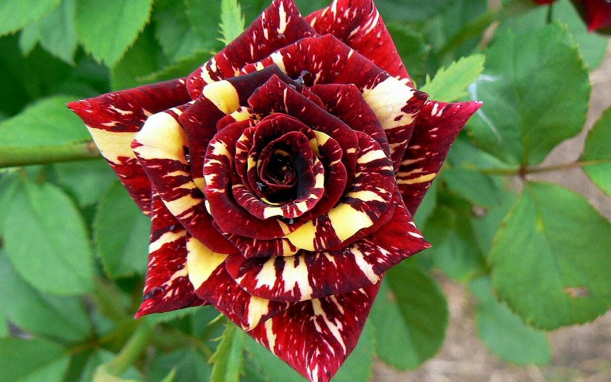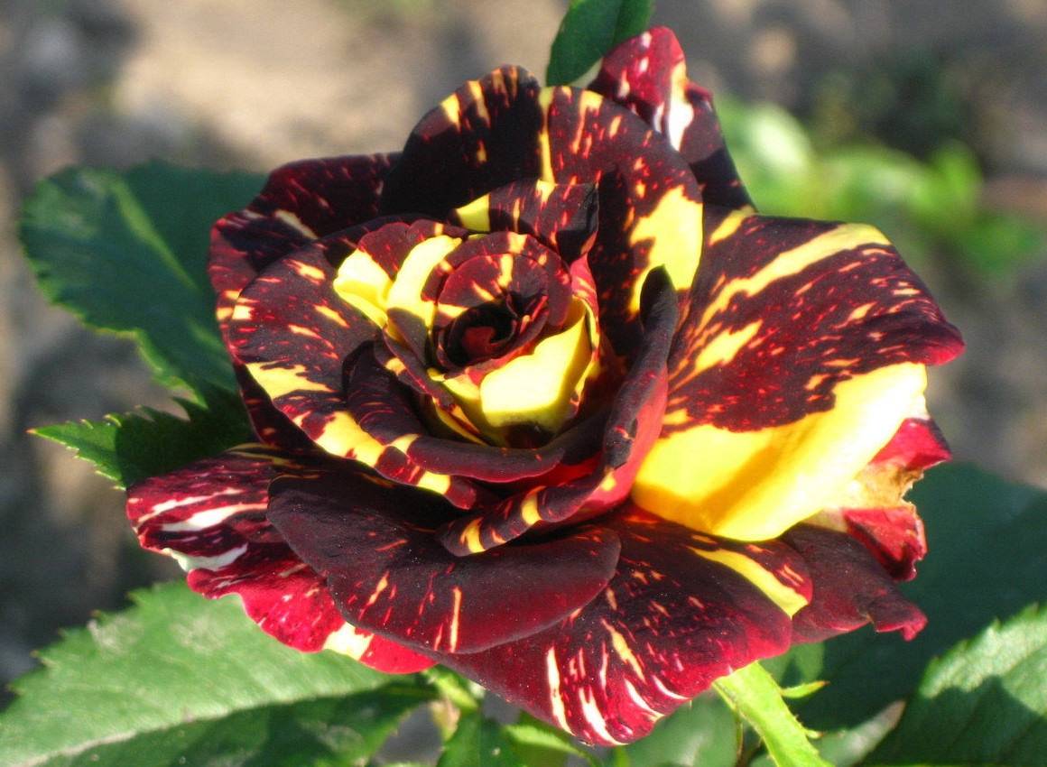 Hocus Pocus is a representative of the floribunda group of varieties. The variety is distinguished by a very original and unusual color. Deep burgundy rose petals are dotted with golden vertical strokes and stripes. Interestingly, the buds on the same bush can be completely different colors, two of the same can not be found. All possible ratios of wine red and yellow are presented: from completely burgundy flowers to almost yellow. There are corollas, divided in half - one half is dark, the other is light. In contrast to the external brightness, the aroma of rose is light, but very pleasant.