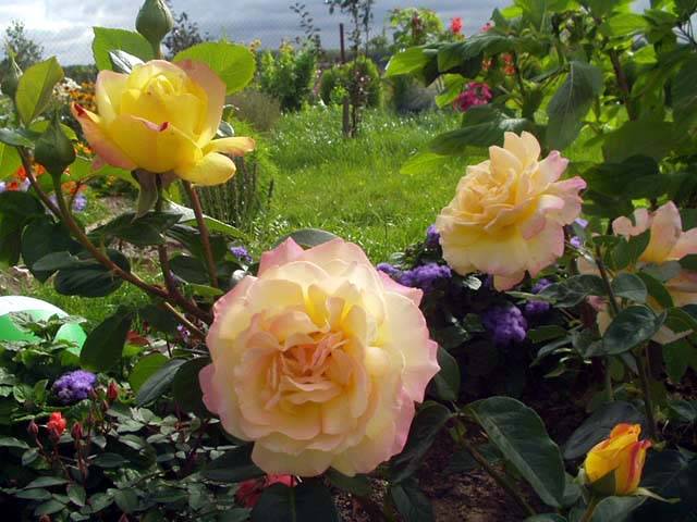 Landscape designers highly appreciate the positive qualities of the Gloria Day rose and use it to decorate gardens, parks, squares, alleys, flower beds, country complexes. The wicker shape is ideal for climbing. The plant looks great both in solo version and in group compositions. Despite its delicate color, the rose will not get lost even in the company of bright flowers. It goes well with most plants. It will look especially advantageous with: