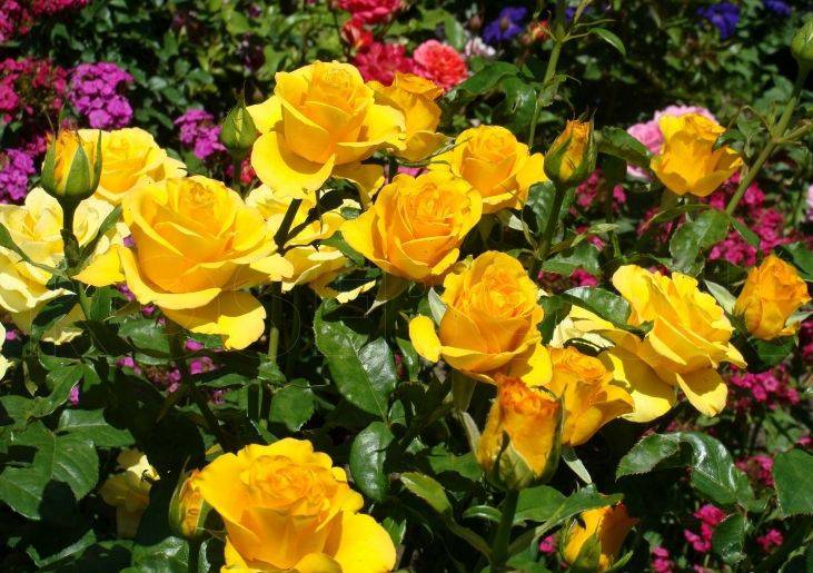 Yellow flowers are used by many landscape designers. They can be either an independent decorative element or be combined with other plants. It is not recommended to plant them next to roses of other varieties and plants with yellow flowers. Against the background of bright Cario, other yellow shades will fade.