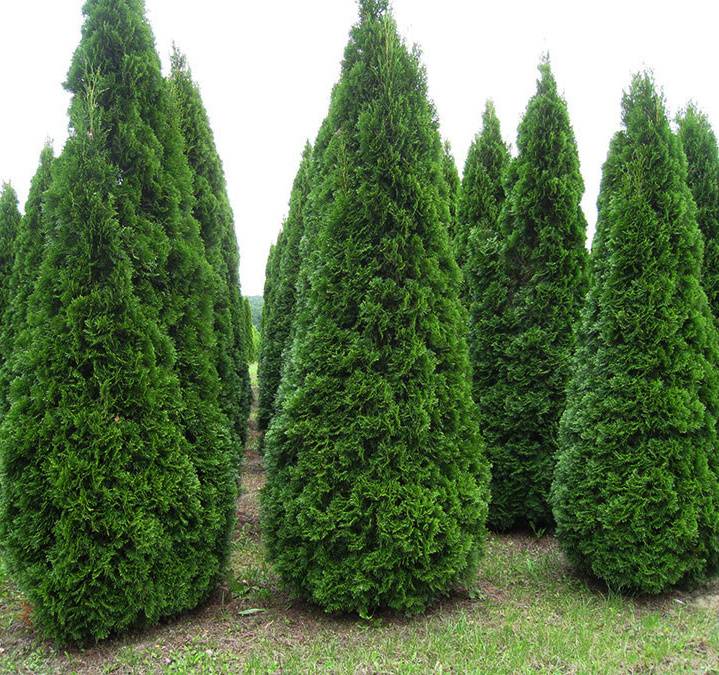 - the Smaragd variety has a pyramidal crown shape, bright green needles. A dynamically growing tree needs to be molded every year. An unkempt thuja can grow in breadth by 2 m in diameter. Annual growth reaches up to 20 cm.