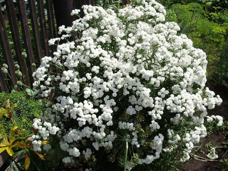 There are many different varieties of this species, however, among flower growers and gardeners, the yarrow variety Ptarmika Pearl mussel is especially popular. This perennial has small green leaves with jagged edges. In summer, flower baskets appear on the plant, painted in a bright white color. Flowering yarrow Pearl mussel begins in June and lasts until the last days of August.