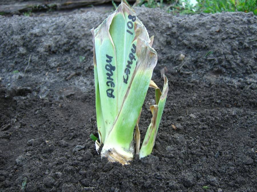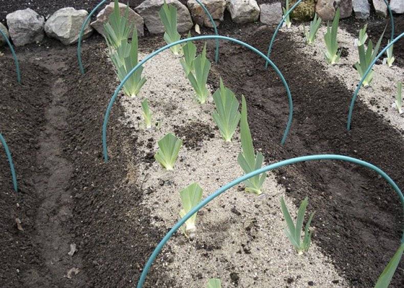 So that in the future the plants do not interfere with each other, a distance of about 50 cm is left between them. This is quite enough to feed the underground part, as well as for the growth of lush ground fans from the xiphoid foliage. At this distance, planting ridges can be formed. Soil mounds about 10-15 cm high will accurately indicate the location of the rhizomes and protect them from freezing in winter.