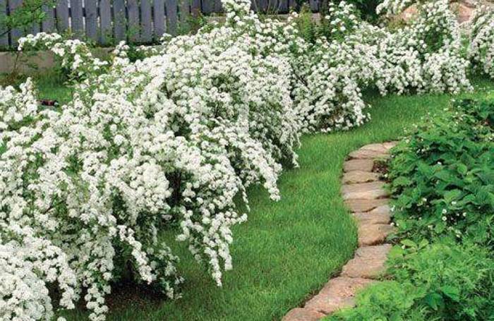 - The ermine mantle is a compact bush, the height of which is in the range of 100-250 cm. Long shoots gently lean towards the ground surface. During flowering, the perennial is covered with semi-double flowers, painted in white tones. The plant gives off an amazing aroma with hints of strawberries. At the end of spring, the buds begin to bloom.