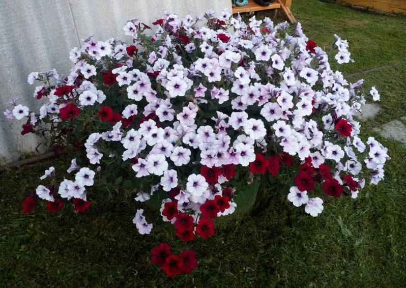 La floración comienza a principios de junio y después de unas semanas se vuelve tan abundante que la masa verde de la petunia es completamente invisible debido a las flores.
