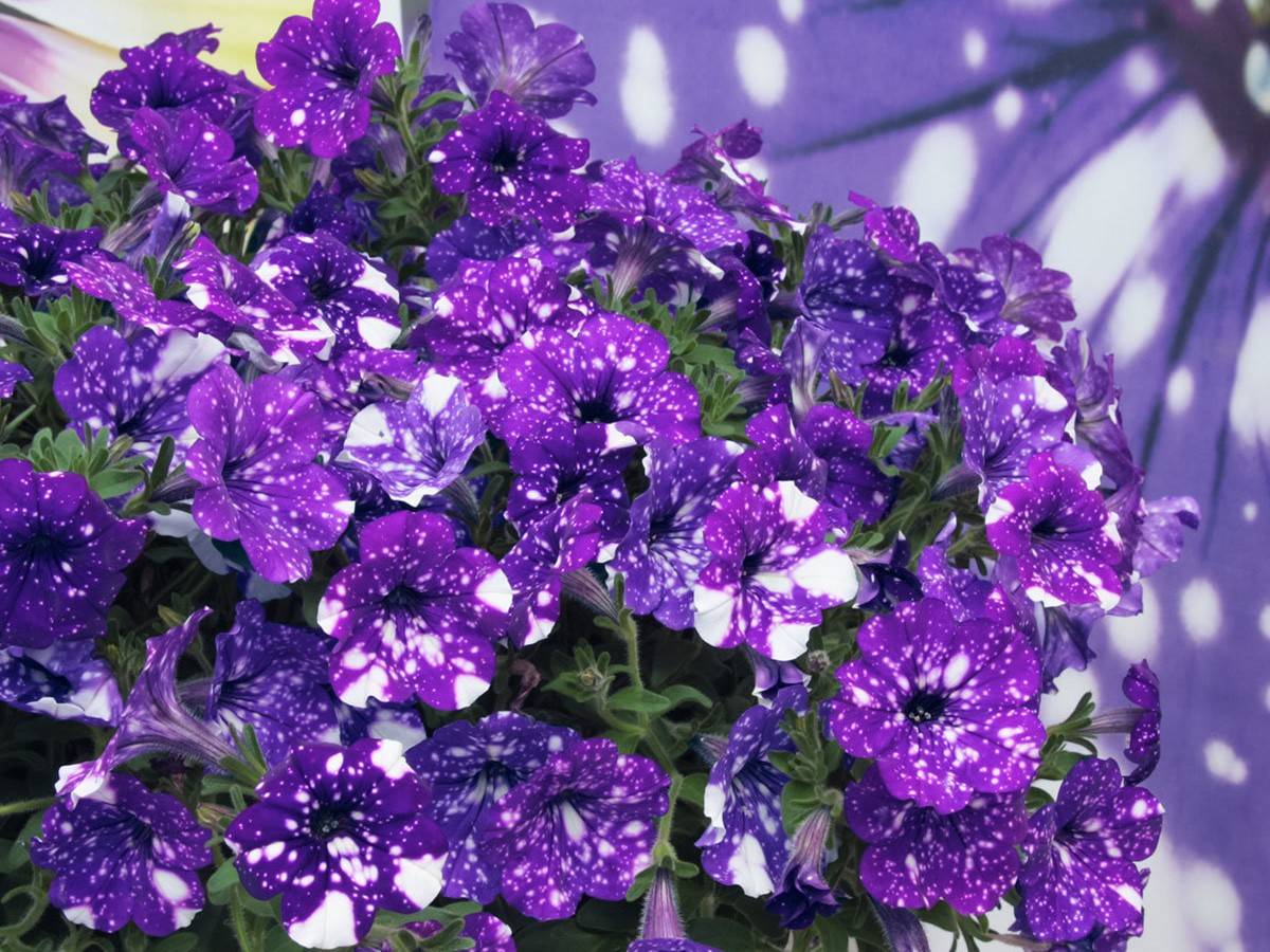 Otra novedad entre las variedades ampelosas de petunias es el Starry Sky. Esta variedad ganó popularidad de inmediato entre los cultivadores de flores. La variedad apareció en 2015 gracias a los esfuerzos de los criadores alemanes. Ya por el nombre de la flor, está claro cómo se ven sus capullos. Pequeños y de felpa al tacto, tienen forma de estrella y están pintados de un azul profundo con tintes violáceos. Pero su característica más distintiva e inusual son las motas blancas en los pétalos, lo que los hace parecerse a un cielo estrellado.