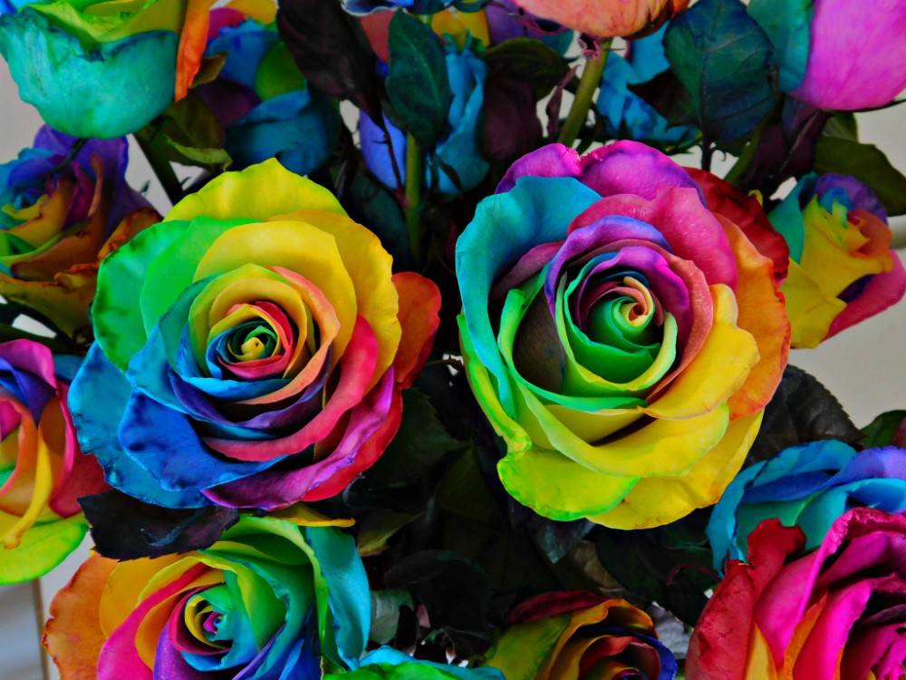 Las rosas arcoíris se consideran plantas exóticas raras. La esencia de su cultivo es simple: toman una rosa blanca y cortan el tallo en varios canales, a los que se les suministra agua, coloreada para cada parte con el color deseado. Entre las rosas más bellas del mundo, es difícil encontrar flores más coloridas y memorables.