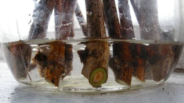 Les boutures sont enracinées dans une eau douce qui ne contient ni sels ni impuretés. Il est préférable d'utiliser de l'eau de fonte ou de l'eau de pluie pré-stockée. Un petit volume d'eau est versé au fond d'un récipient transparent. Les extrémités des boutures doivent être enfoncées au-dessus du premier bourgeon inférieur. Le récipient avec des boutures est recouvert d'un bouchon en verre ou en plastique transparent (pot, bouteille).