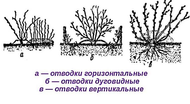 Les couches arquées sont les branches d'une plante pliées en un arc concave. Ils sont épinglés à la place du pli au fond des rainures avec un sol humidifié, creusé à côté du buisson mère. Les rainures sont immédiatement recouvertes de terre. Les parties supérieures des pousses restent à la surface de la terre. Pour qu'ils se tiennent debout, ils sont attachés à des chevilles en bois. Le sol au-dessus du lieu de fixation des couches est constamment humidifié.