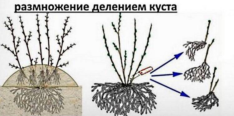 Avec un sécateur tranchant, coupez le buisson en morceaux, chacun d'eux doit contenir au moins 2 jeunes tiges. Les boutures sont plantées dans des trous pré-préparés avec un sol fertile, renversés avec de l'eau avec l'ajout de préparations fongicides. L'utilisation de la solution Fitosporin-M aidera à protéger les racines des plantes contre les infections fongiques.