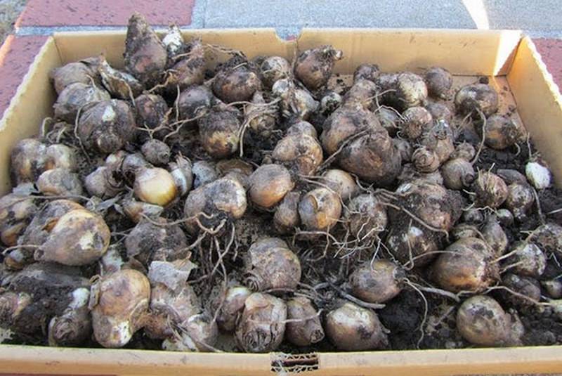 Avant d'envoyer les ampoules au stockage, il est nécessaire de les désinfecter dans une solution faible de permanganate de potassium. Après cela, séchez le matériel de plantation pendant une semaine. Ne peut pas être séché au soleil. Il est préférable d'effectuer cette procédure dans une pièce sombre et sèche à une température de +20 ° C.