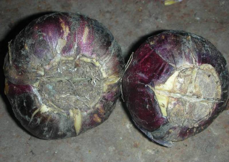 Le matériel malade est jeté avant d'être envoyé pour stockage. Que dois-je faire avec ça? Plus la maladie est détectée tôt, mieux c'est. Ces bulbes doivent être traités dans une solution sombre de permanganate de potassium et conservés séparément des échantillons sains.
