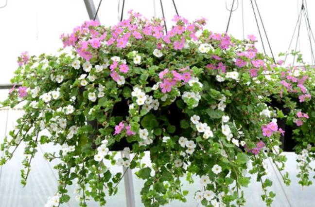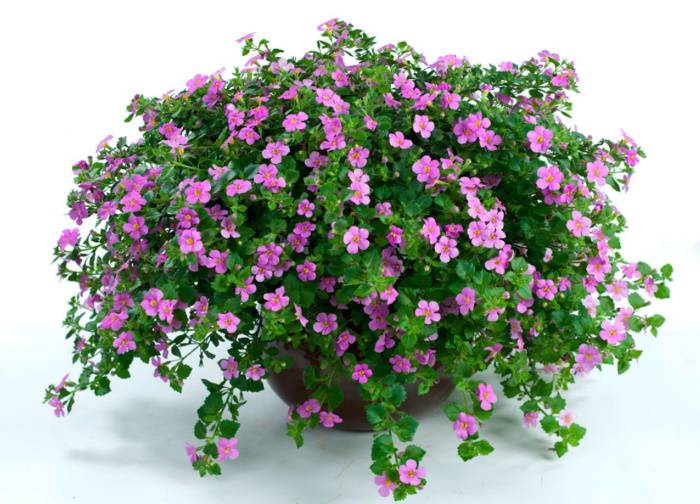I fiori ampelosi di Bacopa sono delicate infiorescenze a forma di campana che crescono dalle ascelle delle foglie. I suoi fiori rosa, bianchi, viola, blu e rossi che crescono su steli allungati con foglie ricurve seghettate sembrano spettacolari e insoliti. Il diametro della corolla a 5 petali è di circa 2 cm Al centro del fiore sono presenti brevi stami e antere. Dopo la maturazione delle ovaie, compaiono i baccelli dei semi, in cui si forma un gran numero di semi simili alla polvere.