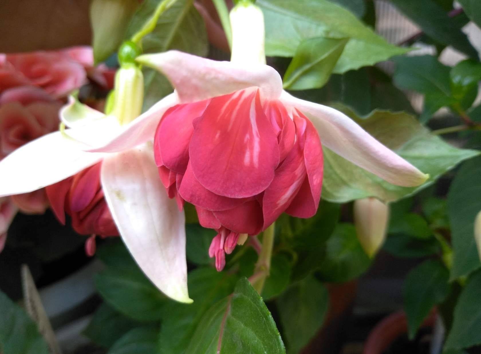 L'ampio fucsia di medie dimensioni di Pichi ha sepali bianchi con una gonna rosa freddo. I grandi fiori doppi acquisiscono gradualmente una tonalità di pesca. Una pianta amante del sole che tollera bene l'inverno.