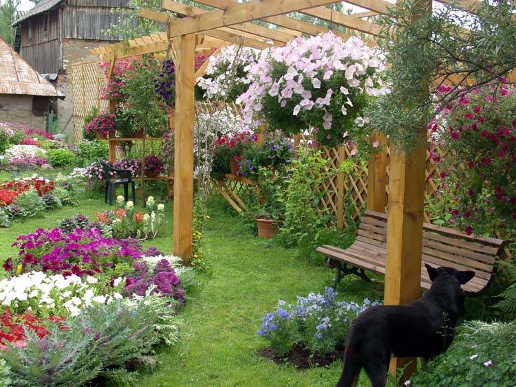 Nel giardino del cottage estivo, i fiori in vasi sospesi, su vasi da fiori alti e persino nelle siepi appariranno molto belli.