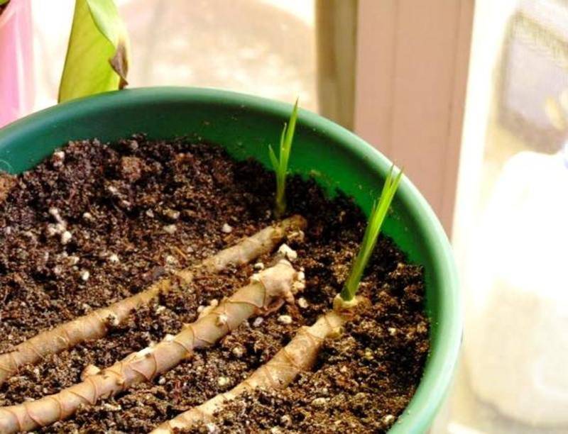 Le talee vengono radicate allo stesso modo delle talee tagliate dall'alto. Ma se, nel caso delle talee apicali, la piantina viene piantata verticalmente nel terreno, allora con le talee le talee possono essere collocate nel terreno in posizione orizzontale. Ciò richiederà una grande pentola con un diametro di 20-25 cm e terreno per il radicamento. Il gambo è adagiato orizzontalmente a terra e premuto un po 'su di esso; non è necessario cospargerlo sopra di terra. Prima del radicamento, il terreno va annaffiato abbondantemente, la terra deve essere morbida, altrimenti non funzionerà a premere delicatamente il fusto senza danneggiarlo.