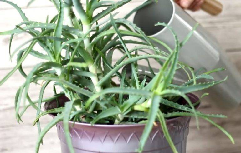 - Il terreno con piante adulte viene annaffiato abbondantemente da un annaffiatoio, evitando il contatto con le foglie - l'accumulo di liquido nelle prese di aloe può portare alla decomposizione del fusto. Affinché il terreno assorba tutta l'umidità, viene preliminarmente allentato. Non è necessario dirigere il flusso d'acqua alle radici: questo potrebbe esporle.