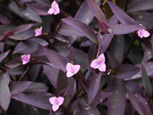 Durante la fioritura, che avviene alla fine dell'estate, la Tradescantia continua ad essere nutrita. Durante questo periodo, l'aspetto della pianta cambia. Compaiono piccoli fiori, solitamente blu o bianchi. Purple Tradescantia ha boccioli rosa tenue. Sembrano piuttosto impressionanti sullo sfondo delle foglie scure.