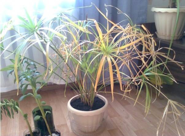 In piena luce, il fogliame brucia sotto forma di macchie grigie. Essere in una pentola angusta rallenta lo sviluppo del cespuglio; è necessario preparare un grande contenitore e nuovo terreno per trapiantare il cipero.