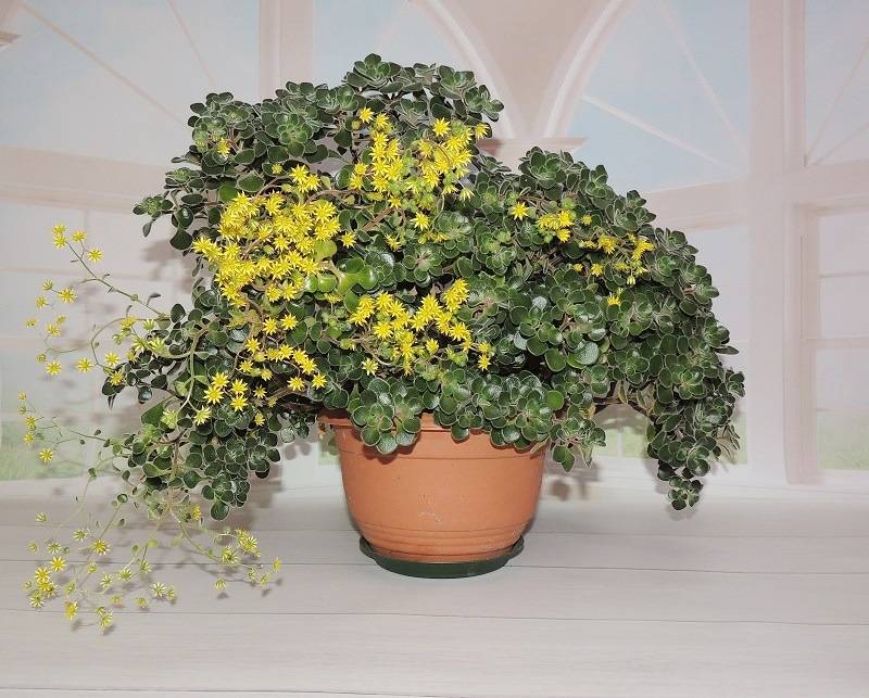 L'altezza del cespuglio cubico raggiunge i 40 cm Le foglie si trovano su lunghi piccioli, possono avere un bordo rosato. Le infiorescenze sono cespugli voluminosi con fiori giallo oro del diametro di 1,5 cm Questa specie spende quasi tutte le sue energie per la fioritura, quindi dopo aver perso la maggior parte delle foglie. Spesso, dopo la fioritura, la pianta muore.