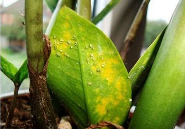 Se la zamioculca diventa gialla, è necessario estrarre con urgenza la pianta dal vaso ed esaminare attentamente le foglie e le radici. Non dovrebbero esserci piccoli parassiti sulla corona. Nel sistema radicale, anche tutti i tipi di insetti amano iniziare, che prosperano su tuberi succosi in terreno caldo umido. Se sulla pianta sono comparsi parassiti, è necessario trattarlo con una preparazione insetticida, pulire il fogliame dagli insetti con le mani e tagliare i tuberi danneggiati.