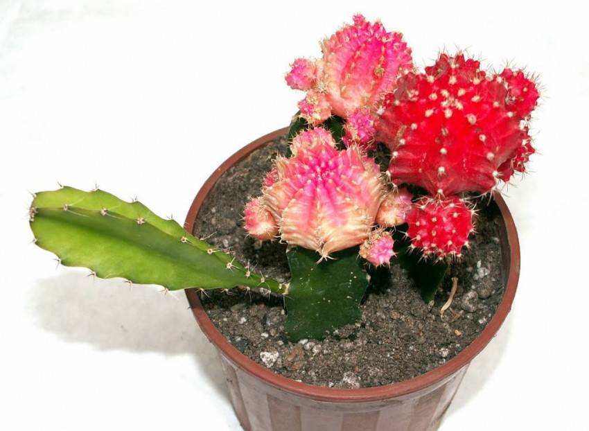 Un metodo interessante per ottenere una nuova specie di pianta è l'innesto. Non è davvero un vaccino, ma una combinazione di due tipi diversi. I cactus senza clorofilla sono molto adatti a questo. Queste specie non crescono bene individualmente. Quando viene incrociato con un cactus verde, la vitalità della specie rossa aumenta. Il risultato è un cespuglio con rami rossi e verdi.