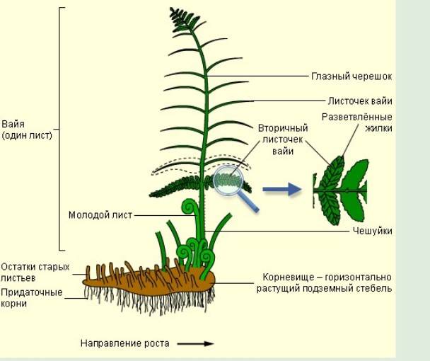 La formazione di una forma più piatta sulla superficie dei rami ha portato all'attivazione della fotosintesi e alla loro migliore sopravvivenza. Nelle zone tropicali, la lunghezza di una fronda annuale può raggiungere diversi metri, nei climi temperati i germogli crescono fino a 1,5 m. Inoltre, le spore maturano in piano sul lato inferiore delle foglie, con l'aiuto di cui la pianta si riproduce.
