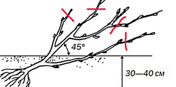 La piantina stessa è posta sopra la fossa ad angolo. Il terreno nella fossa viene compattato, annaffiato di nuovo, cosparso di terra asciutta. I rami vengono tagliati, lasciando non più di 2-3 gemme su ciascuno.